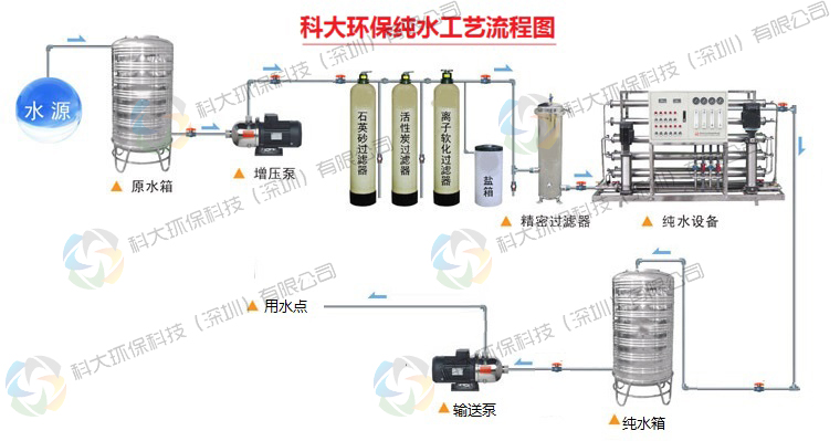 自來水---->原水箱---->供水泵---->多介質(zhì)過濾器---->活性炭過濾器---->軟化過濾器---->保安過濾器---->高壓泵---->反滲透機(jī)組---->純水箱---->恒壓輸送系統(tǒng)---->用水點(diǎn)