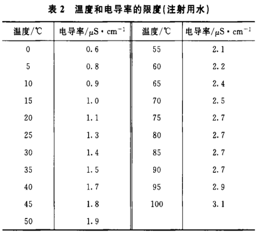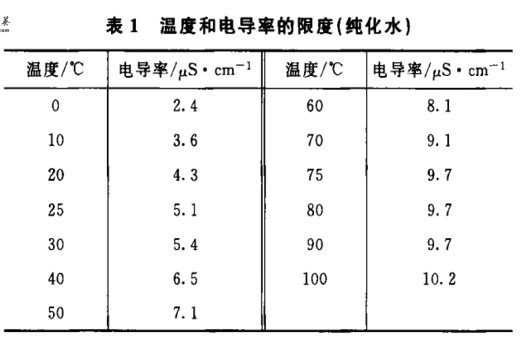 純化水可使用在線或離線電導率儀,記錄測定溫度。在表1中,測定溫度對應的電導率值即為限度值。如測定溫度未在表1中列出:則應采用線性內插法計算得到限度值。如測定的電導率值、不大于限度值,則判為符合規定;如測定的電導率值大于限度值,則判為不符合規定