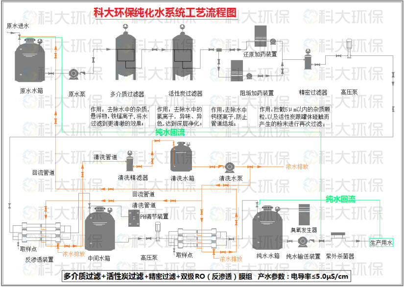 原水→原水泵→多介質(zhì)過濾器→活性炭過濾器→阻垢加藥裝置→還原加藥裝置→精密過濾器→一級高壓泵→一級級反滲透 →PH調(diào)節(jié)→中間水箱→二級高壓泵→二級反滲透(反滲透膜表面帶正電荷)→純化水箱→臭氧發(fā)生器→純水輸送泵→紫外線殺菌器→用水點